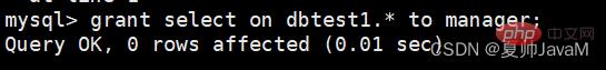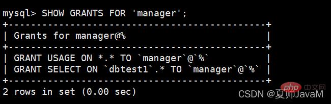 GRANT privileges ON table_name TO 'role_name'[@'host_name'];例子:为manager角色授予查看dbtest1数据库下所有表的权限