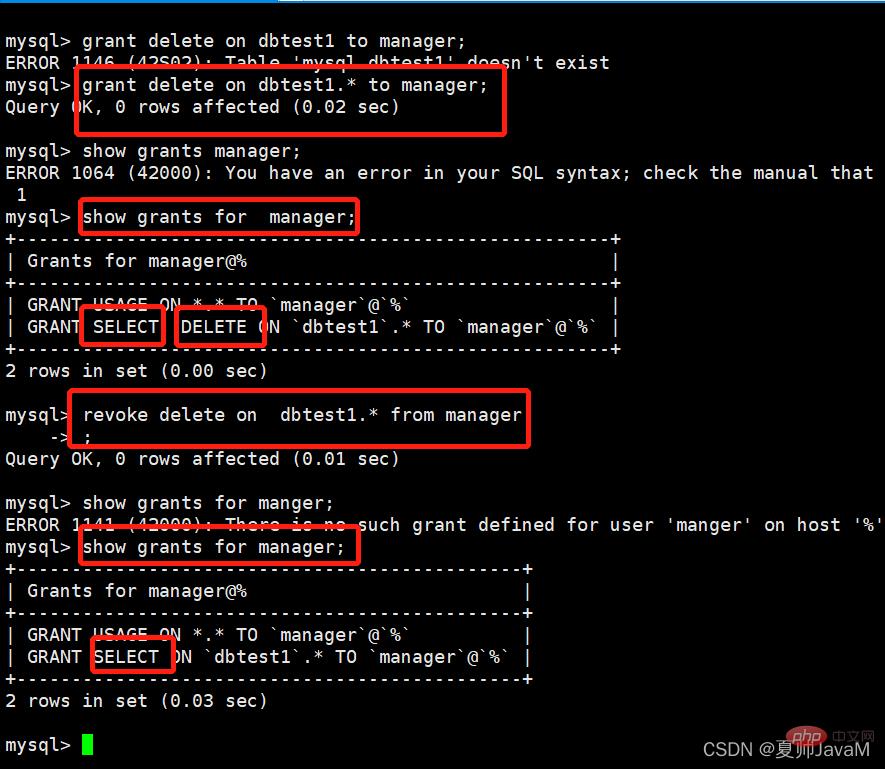 REVOKE privileges ON tablename FROM 'rolename';现在我们给manager在加一个delete的权限,然后把这个权限再收回