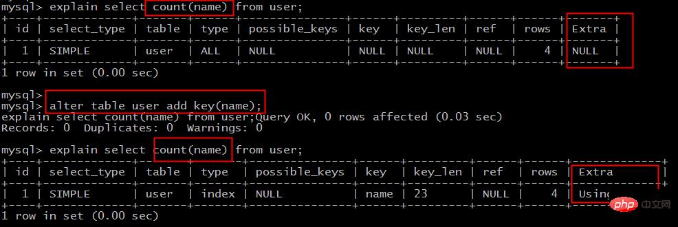 select count(name) from user;添加索引,就能够利用索引覆盖提效