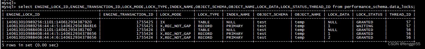 mysql> select ENGINE_LOCK_ID,ENGINE_TRANSACTION_ID,LOCK_MODE,LOCK_TYPE,INDEX_NAME,OBJECT_SCHEMA,OBJECT_NAME,LOCK_DATA,LOCK_STATUS,THREAD_ID from performance_schema.data_locks;