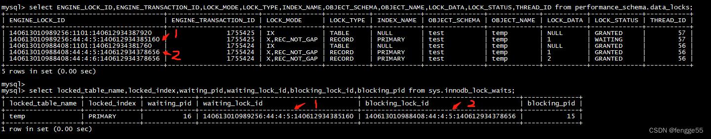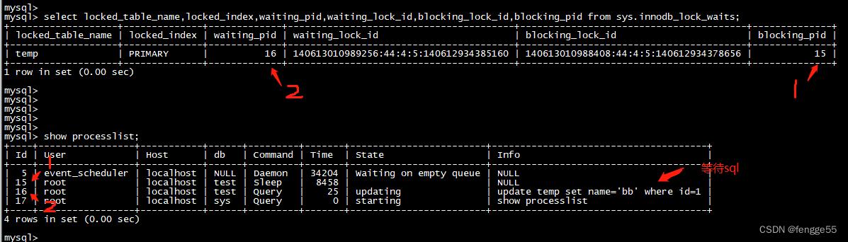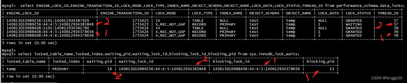 再次对比下。可以找到关系,1等待的事务处理,是被2阻塞了。也就是锁住了,需要2释放锁,1才可以执行