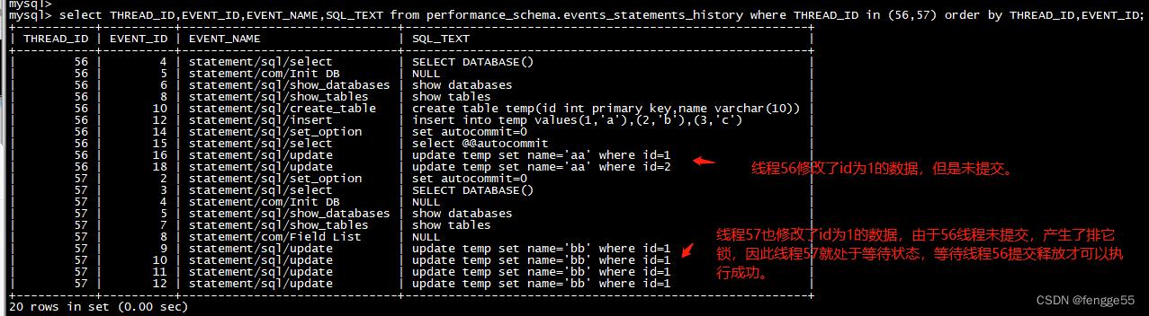 mysql> select THREAD_ID,EVENT_ID,EVENT_NAME,SQL_TEXT from performance_schema.events_statements_history where THREAD_ID in (56,57) order by THREAD_ID,EVENT_ID;