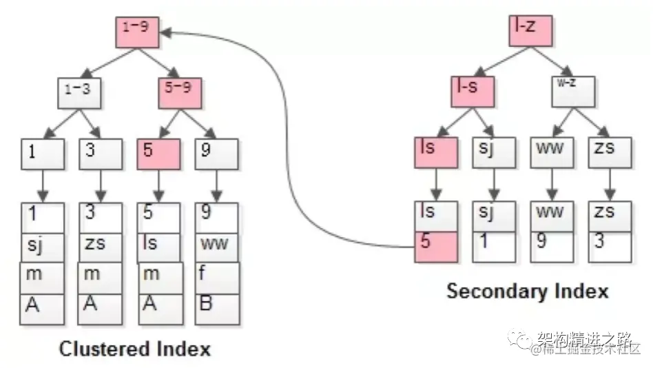 路径需要扫描两遍索引树,第一遍先通过普通索引定位到主键值id=5,然后第二遍再通过聚集索引定位到具体行记录。