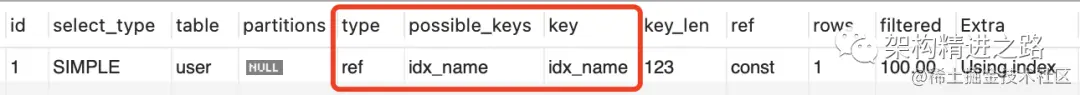 explain select id, name from user where name = 'lisi';explain分析:因为name是普通索引,使用到了name索引,通过一次扫描B+树即可查询到相应的结果,这样就实现了覆盖索引