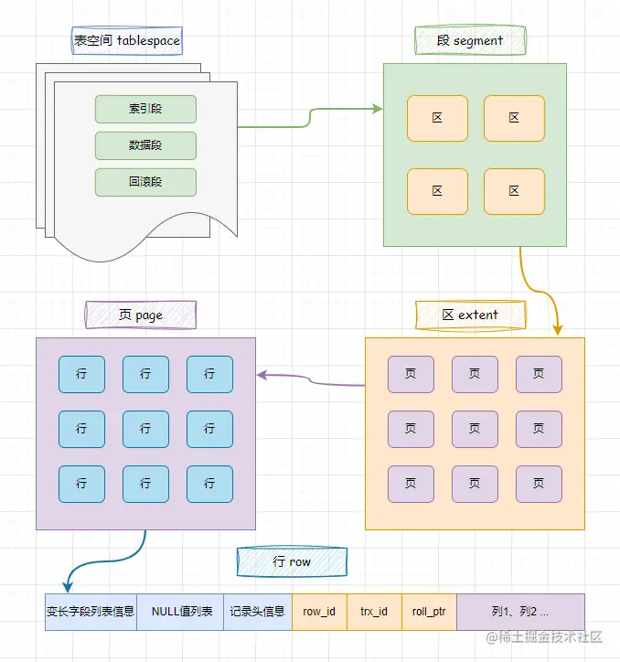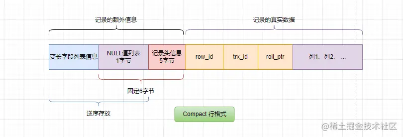 MySQL也是以【行 row】进行存储的,图中对于行的描画图是 COMPACT格式,这也是重点需要了解的格式,而不同的行格式,存储的结构也不同。