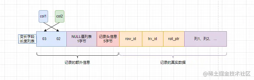 额外信息为的是更好的管理记录,分为变长字段长度列表、NULL值列表、记录头信息