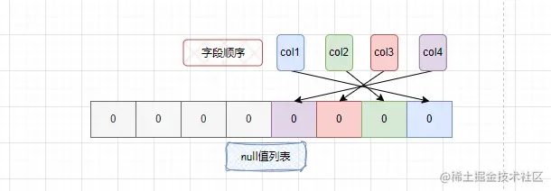 - null值列表是通过bit位来进行标识的,一个字段占一个比特位,bit位按字段逆序排列