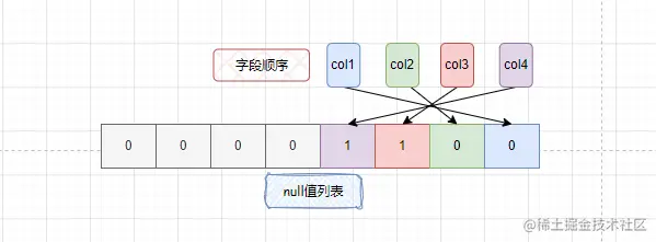 - 字段值为null的bit位为1,否则为0