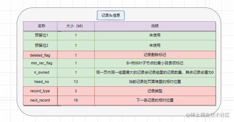 - record_type:表示当前记录的类型,0:表示普通记录,1:表示B+树非叶子节点记录,2:表示最小记录(Infimum),3:表示最大记录(Supremum)