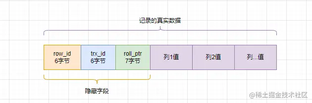 - row_id:如果我们指定了主键或者唯一约束列,那么就没有 row_id 隐藏字段了。如果既没有指定主键,又没有唯一约束,InnoDB 才会为记录添加 row_id 隐藏字段。row_id不是必需的,占用 6 个字节。