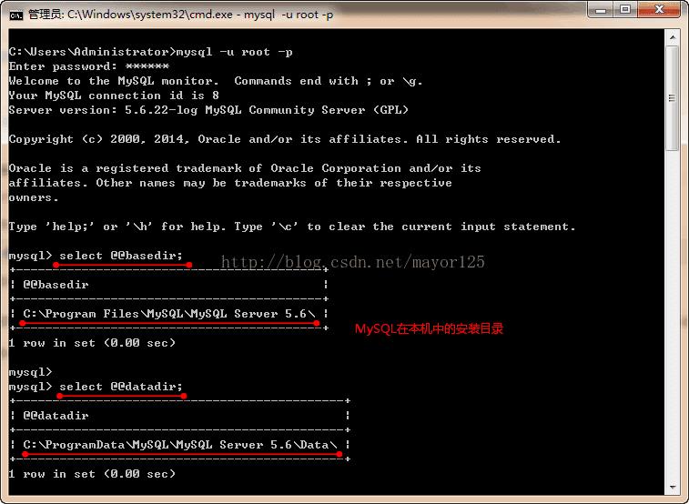 在DOS命令行窗口登录MySQL,输入如下命令查看MySQL的安装目录和数据存放目录,