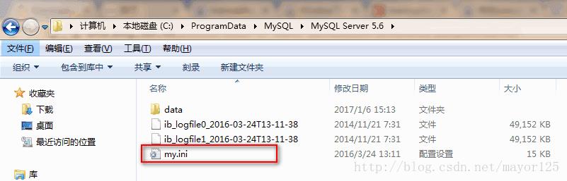 我们可以看到在“C:ProgramDataMySQLMySQL Server 5.6”目录下面找到了my.ini文件。