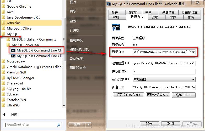 在“开始 → 所有程序 → MySQL”下面找到MySQL的命令行客户端工具,右键选择该命令行工具查看“属性”,在“目标”里面也可以看到MySQL使用的配置文件位置。