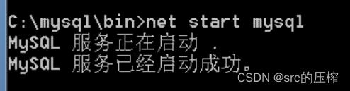 5、bin 命令下运行net start mysql。(目录为自己对应解压的mysql文件bin目录下)