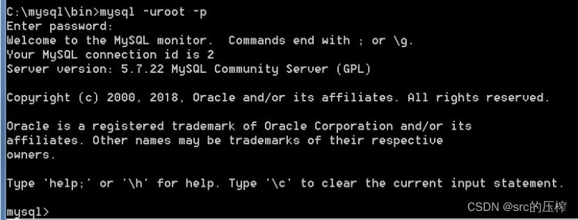 6、Bin 命令下运行mysql –uroot –p。(目录为自己对应解压的mysql文件bin目录下)