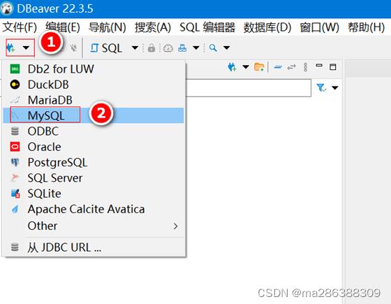 1、 打开Dbeaver后,按下图操作,点击图①的下三角创建数据库连接,然后在选择②的mysql。