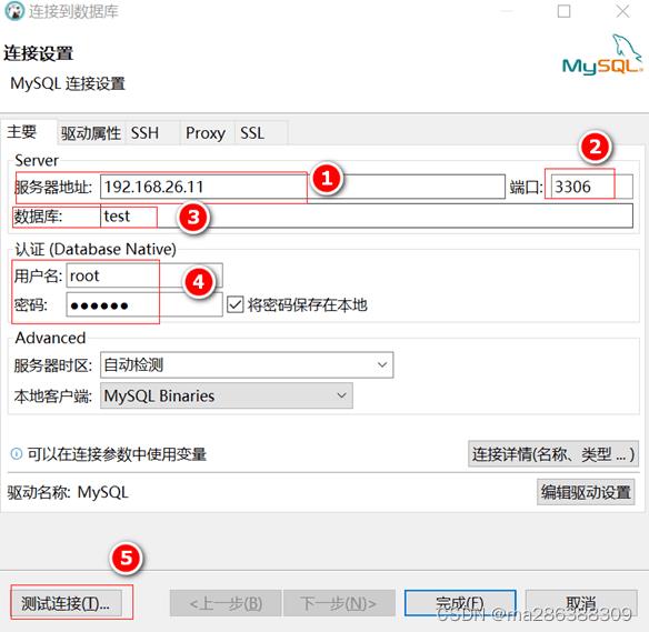 2、按下图的序号顺序填写ip地址、端口、数据库、用户和密码,最后点击连接测试。