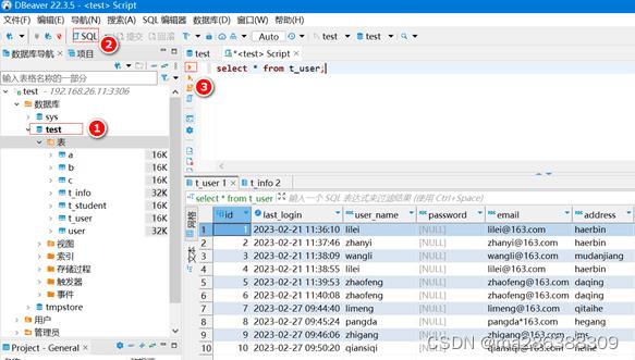 5、使用Dbeaver创建查询窗口。如下图,①选择数据库,②点击创建查询窗口,③输入sql后,点击红色三角号执行sql。