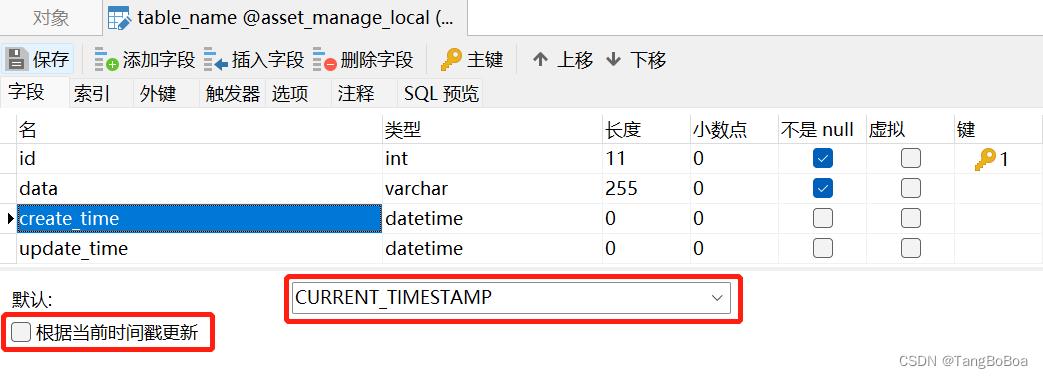 选中列后在默认值写上CURRENT_TIMESTAMP,默认值下面的选项意思是当前列是否要在数据行内容更新时更新当前列时间。