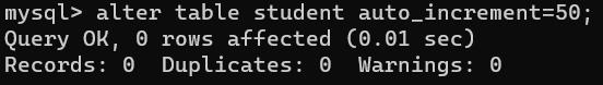 把自增主键的数值(AUTO_INCREMENT)设置为小于等于100的值(以数值50举例),我们可以看到mysql显示修改成功