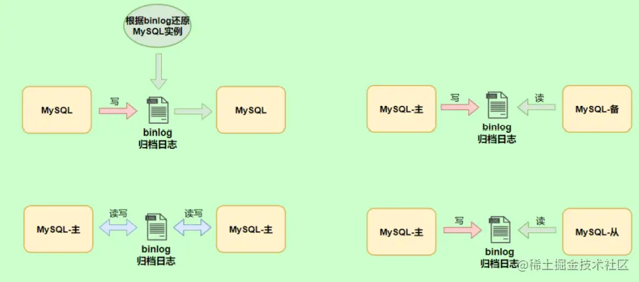 bin log进行数据恢复,因为该日志记录所有数据库所有的变更,保证数据的安全性。 - 数据复制,利用一定的机制将主节点MySQL的日志数据传递给从节点,实现数据的一致性,实现架构的高可用和高性能。