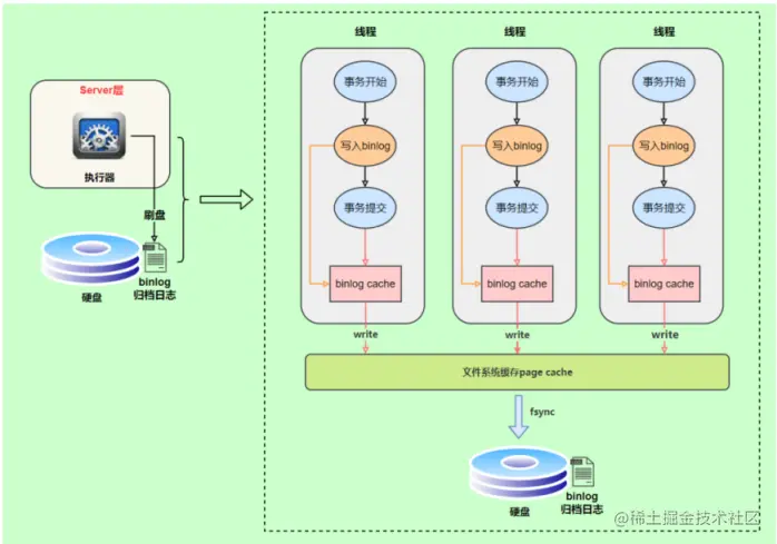 binlog cache中的数据统一写道文件系统缓存page cache中,这个过程速度也很快 - 然后根据不同的策略,将文件系统缓存中的