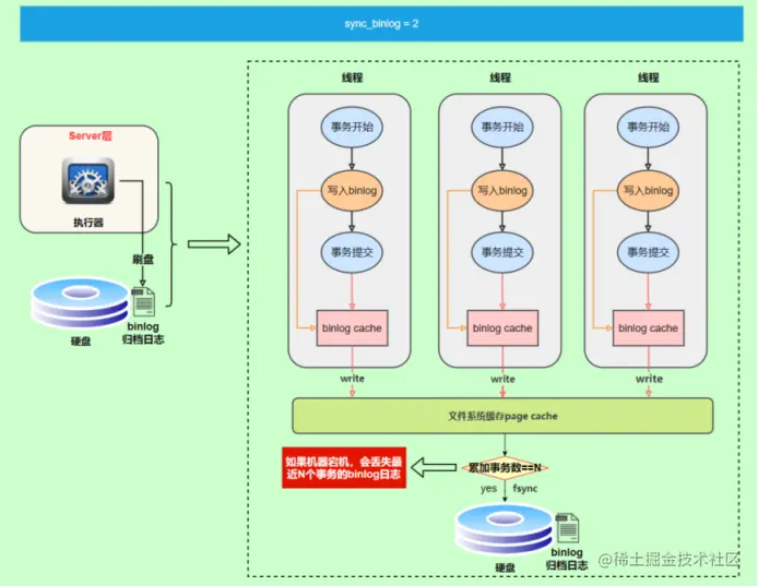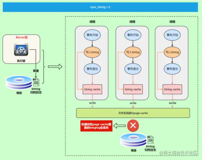 为0的时候,表示每次提交事务都只write,由系统自行判断什么时候执行fsync。虽然性能得到提升,但是机器宕机,page cache里面的binglog会丢失。