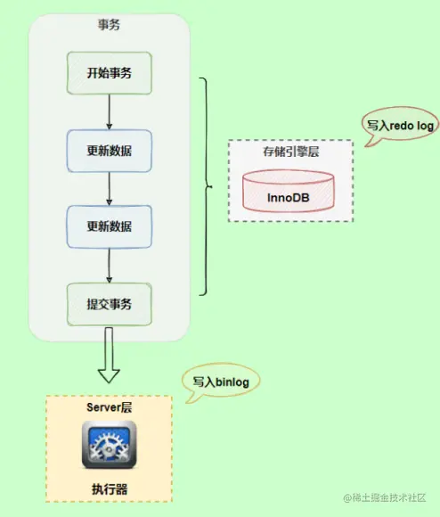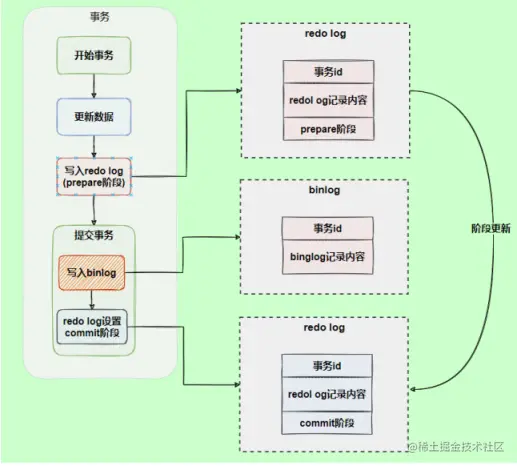 为了解决两份日志之间的一致性问题,InnoDB存储引擎使用两阶段提交方案。将redo log的写入拆成了两个步骤prepare和commit。