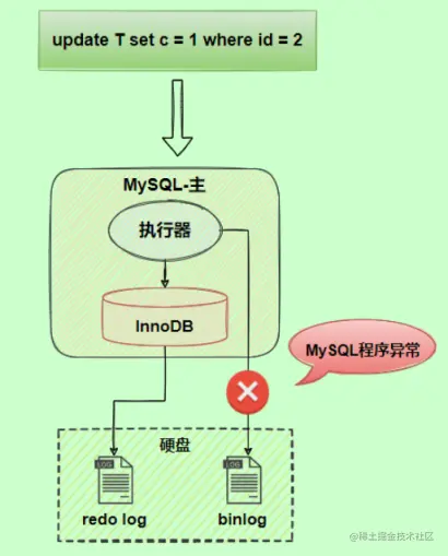 假如事务执行sqlupdate T set c = 1 where id = 2,在写完redo log日志后,bin log日志写期间发生了异常,会出现什么情况呢?