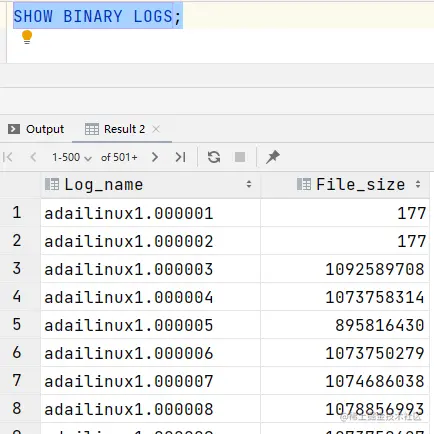通过 SHOW BINARY LOGS;查看当前的二进制日志文件列表及大小,如下图:
