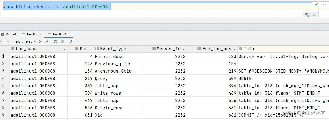 我们可以用show binlog events命令工具查看bin log日志中的内容。