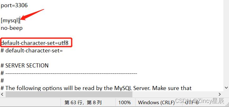 default-character-set=utf8 [mysql] 一般在文档第63行的位置(可以使用Ctrl+ F搜索)