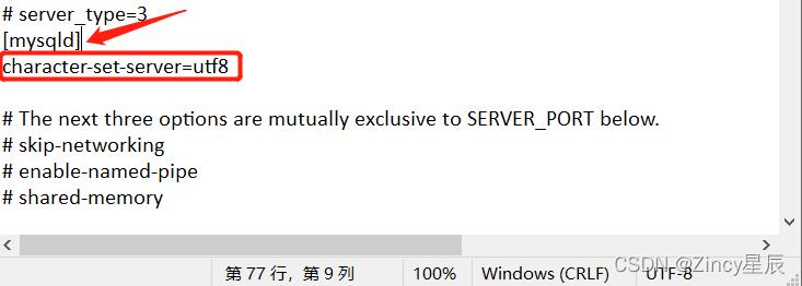 character-set-server=utf8[mysqld] 一般在文档第77行的位置(可以使用Ctrl+ F搜索)