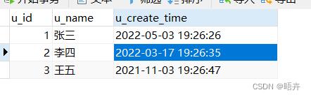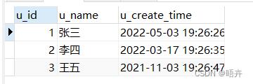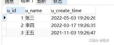 select * from u_user where u_create_time > DATE_SUB(NOW(),INTERVAL 3 MONTH);结果: