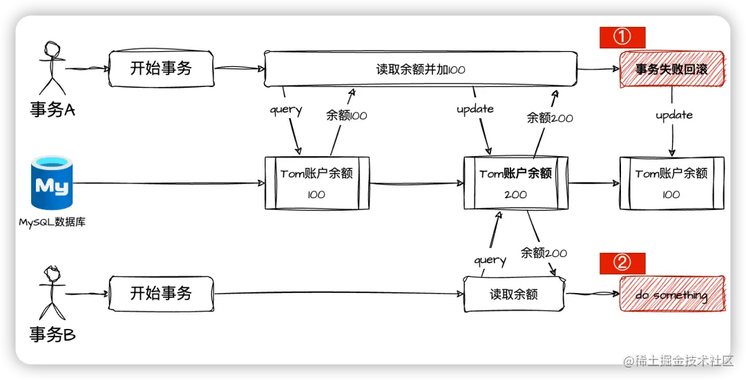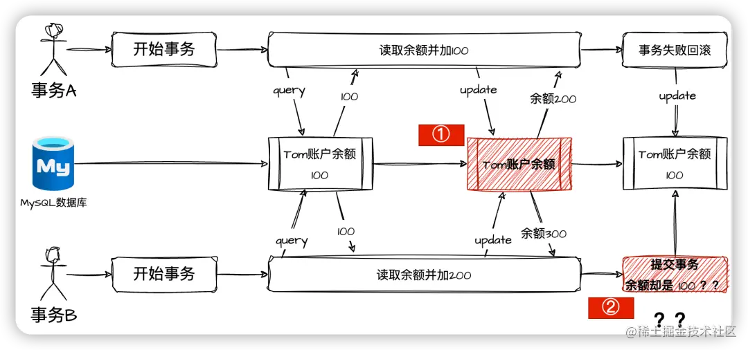 在①处,事务A得到的余额是200,事务B得到的余额是300,如果事务B是后更新,那么就覆盖了事务A的值。