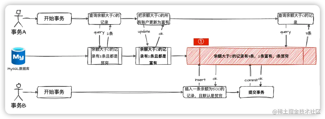 INSERT INTO `bank_balance` (`id`, `user_name`, `balance`) VALUES ('4', 'Eric', '500');在这之后,如果事务A再发起相同条件的查询,会发现刚刚的更改对于某些数据未起作用(有些记录未被标识为富有),而且数据行比原来还多了!
