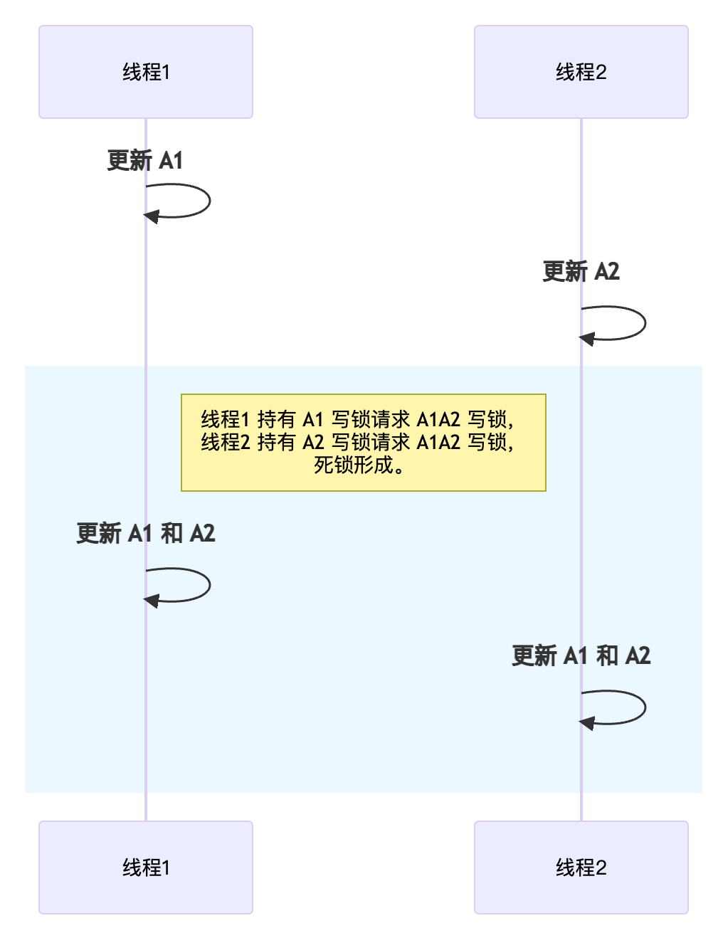 线程两 先更新 A两,此时会对于 A两 地点止添写锁,再更新 A1 以及 A二,此时会异时给 A1 以及 A二 地址止皆加之写锁。
