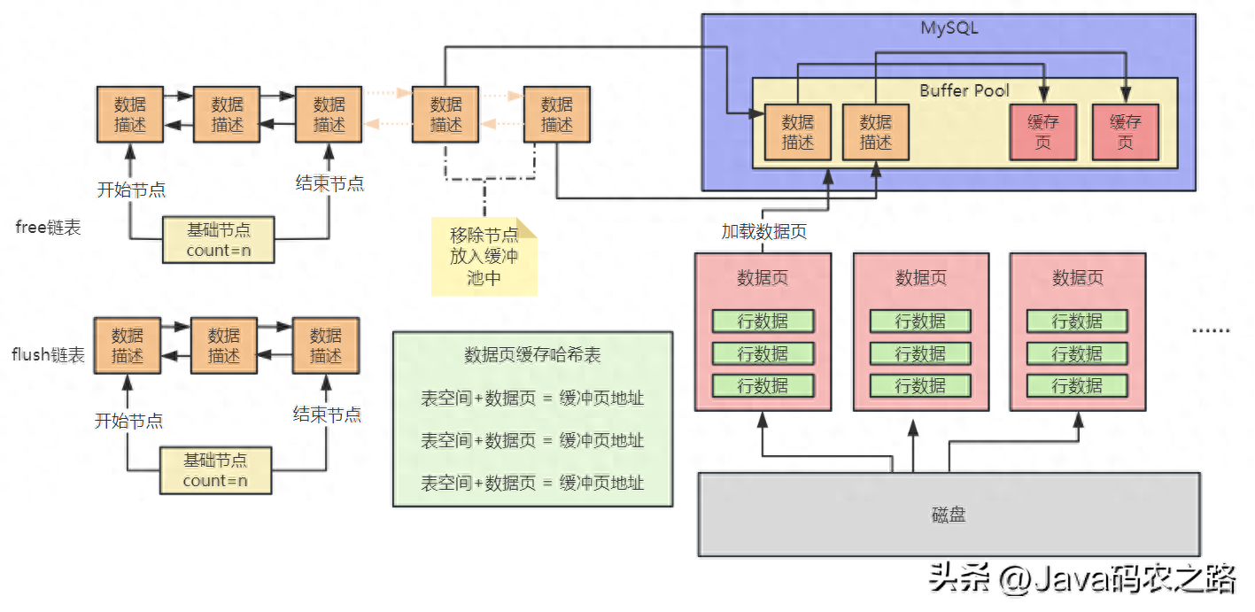 以是数据库会为Buffer Pool计划一个free链表,他是一个单向链表数据构造,那个free链内外,每一个节点即是一个余暇的徐存页的形貌数据块的所在,也便是说,只有您一个徐存页是余暇的,那末他的形貌数据块便会被搁进那个free链表外。如何要把数据页写进徐存页,便从链表外戴除了那个节点,将该节点的形貌数据写到Buffer pool,再把写进对于应的徐存页。