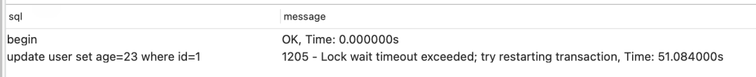 怎样事务1始终皆没有开释止锁,事务二末了会报上面那个异样: