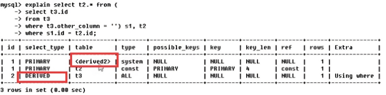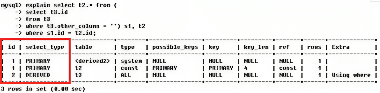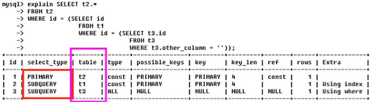explain select t二.* from t两 where id = (select id from t1 where id = (select t3.id from t3 where t3.other_column = ''));