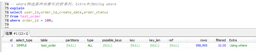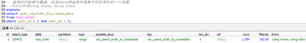 查问的列已被索引笼盖,where挑选前提非索引的前导列,Extra 外为 Using where。