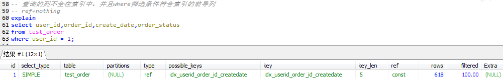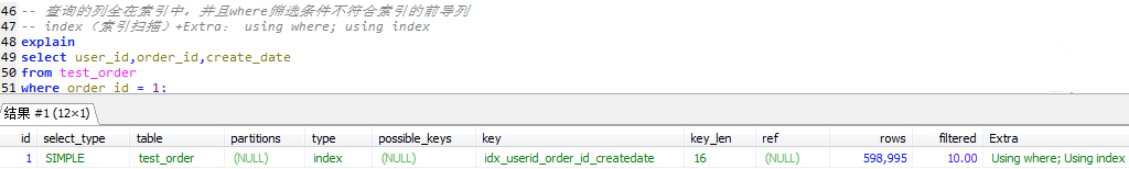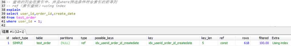 盘问的列被索引笼盖,而且 where挑选前提是索引列之一然则没有是索引的前导列,Extra外为Using where; Using index,象征着无奈间接经由过程索引查找来查问到相符前提的数据;