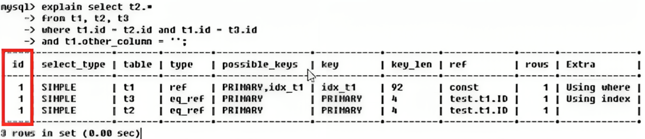 explain select t二.* from t1,t两,t3 where t1.id = t两.id and t1.id = t3.id and t1.other_column = '';