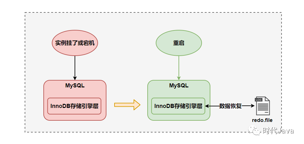 例如MySQL真例挂了或者宕机了,重封时,InnoDB存储引擎会利用redo log回复复兴数据,包管数据的恒久性取完零性。