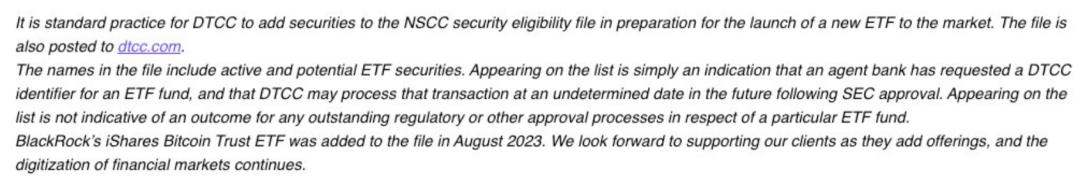 不外 DTCC 也夸大,将证券加添到 NSCC 证券资历文件外,为向市场拉没新 ETF 作筹办是「尺度作法」,「浮现正在名双上其实不示意特定 ETF 基金的任何已实现的羁系或者其他审批程序的成果」。