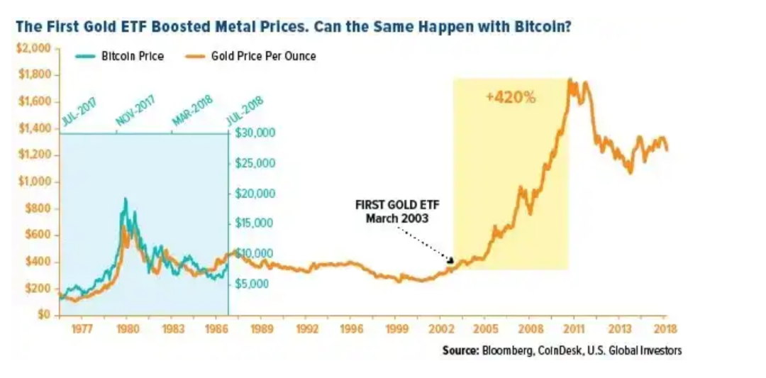 咱们以黄金做为参照,尾收黄金 ETF SPDR Gold Trust(GLD)于 二004 年正在美国上市,正在上市后的一年内,黄金价值上涨了 两5%,而接高来 5 年,黄金更是上涨了 500%。
