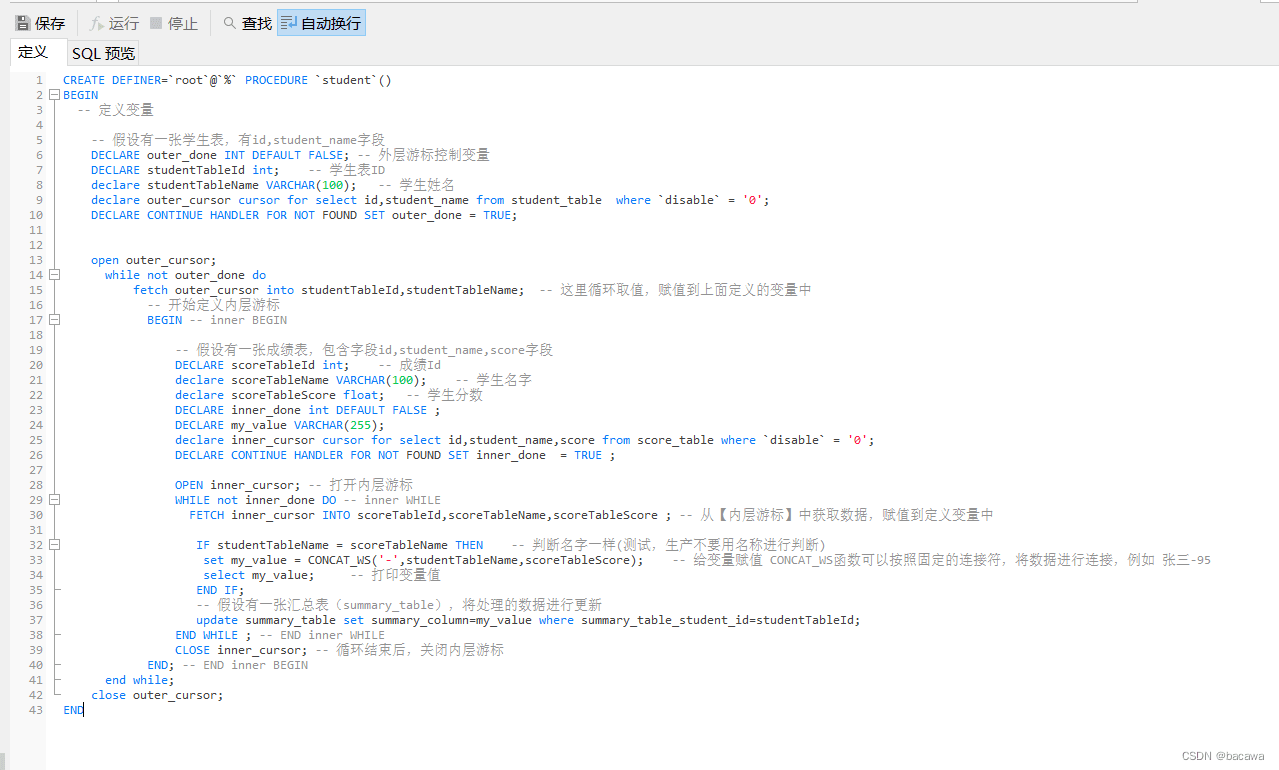 declare inner_cursor cursor for select id,student_name,score from score_table where `disable` = '0';