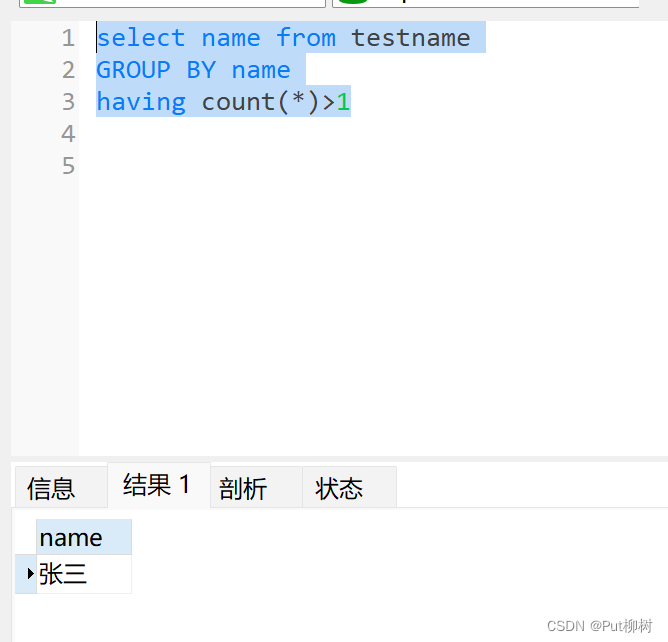咱们利用group by来入止分组,而后再把分组面年夜于1条的数据挑进去天然等于频频的数据。