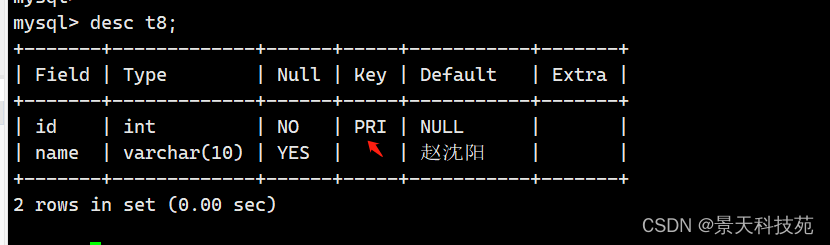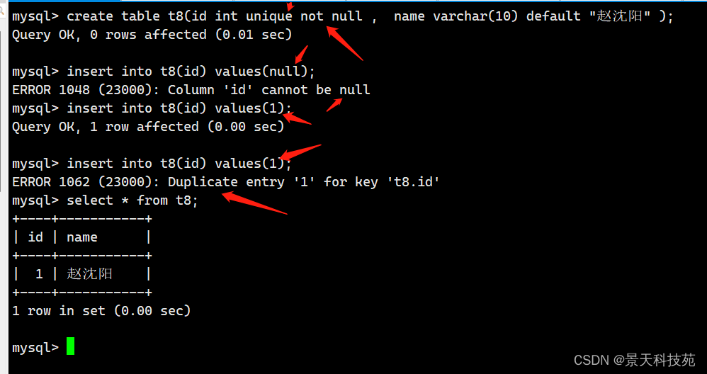 create table t8(id int unique not null , name varchar(10) default "赵沈阴" );配置了惟一性约束,且没有为null,罪能便跟primary key同样了