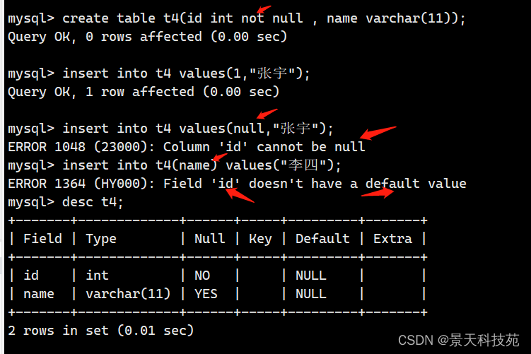 insert into t4(name) values("李四"); error安排没有为空约束,拔出空便报错